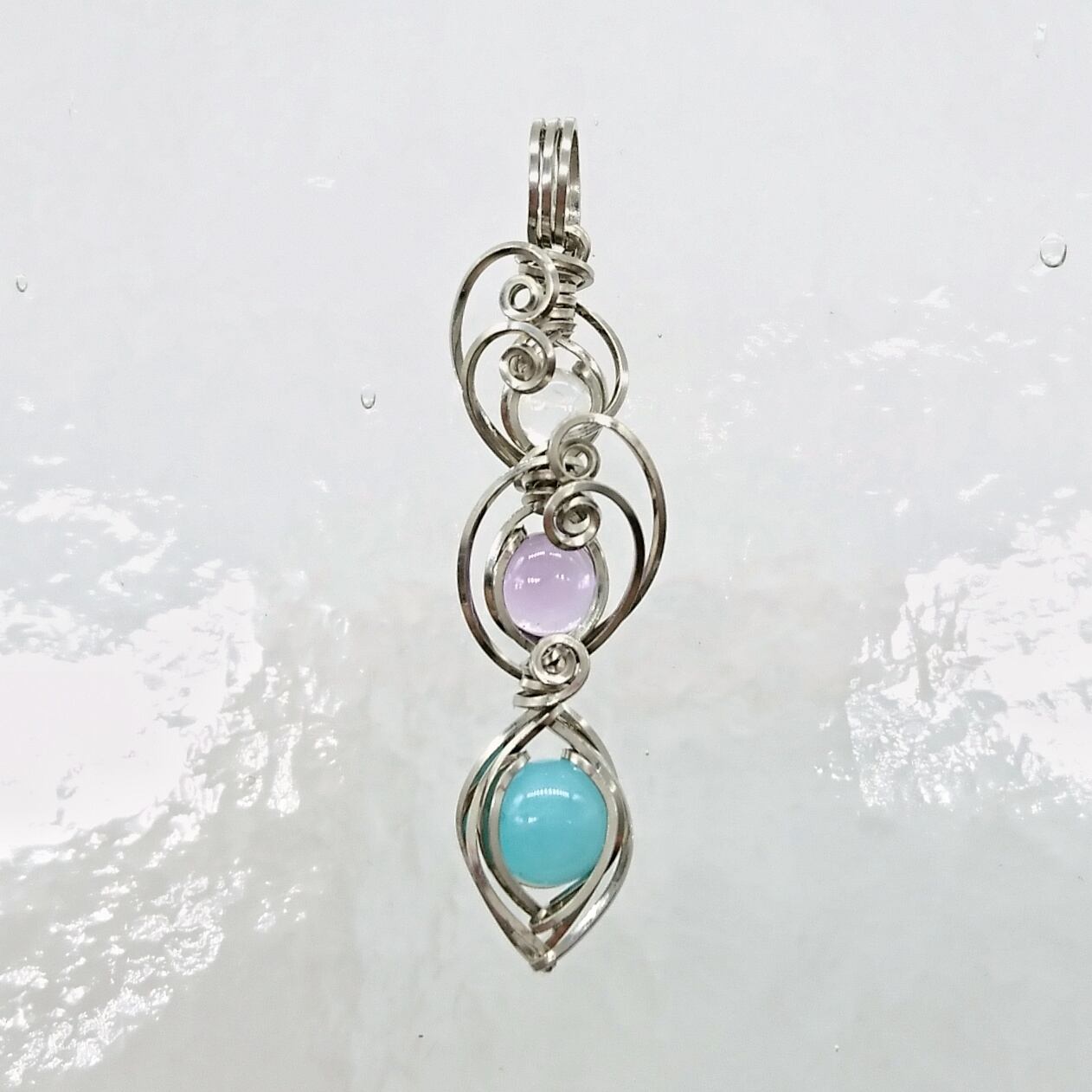 ペルー産の明るい水色のアマゾナイトに、透明度が高いアメシストとホワイトラブラドライト(レインボームーンストーン)を合わせたペンダントトップです。